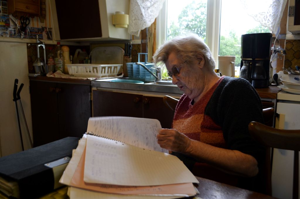 Nu har en veckas campingliv gått och det är dags att återvända till Malmö med allt material. Men innan dess återstår ett besök hos min släkting Gullie Mattsson i Hyltan. Hon härstammar från Slott liksom jag och är en hjälp i mitt arbete. Så fort jag kommer innan för dörren hos henne är vi igång med våra papper och noteringar. Vi spånar runt olika idéer där trådarna hänger lösa och hittar en lösning på hur min historia om Maria Charlotta ska gestalta sig. Lite får man skarva där man inte vet, informationen från andra hälften av 1800-talet är ju mer knapphändig än mormors egen bok om sitt liv.