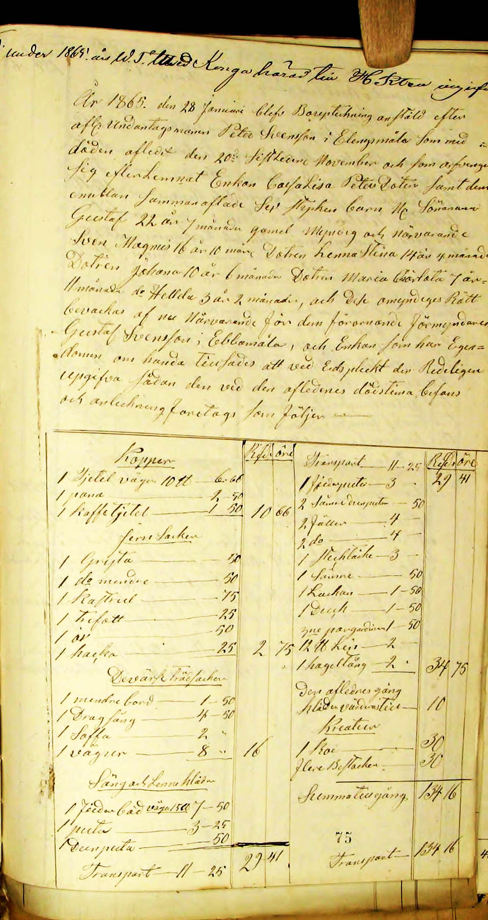 År 1865 den 28 januari blev bouppteckning anförd efter avlidne undantagsman Peter Svensson i Elingsmåla som med döden avlidit den 20 tillförne november och familjearvingar sig efterlämnat. Änkan CajsaLisa Peterdotter samt dem emellan sammanavlade änkans barn Sönerna Gustaf 22 år 7 månader gammal, myndig och närvarande Sven Magnus 16 år 10 månader Dottern LenaStina 14 år 4 månader Dottern Johanna 10 år 6 månader Dottern Maria Charlotta 7 år 11 månader Dottern Hilda 3 år 2 månader. Och de omyndiges rätt bevakas nu av den förvarande förmyndaren Gustaf Svensson i Ebbamåla. Och änkans familj har egendomen omhanda tinlade att vid edsplikt den redeligen uppgifva sådan den vi den avlidnes dödstimma befanns och anteckningsföretags form följer:
