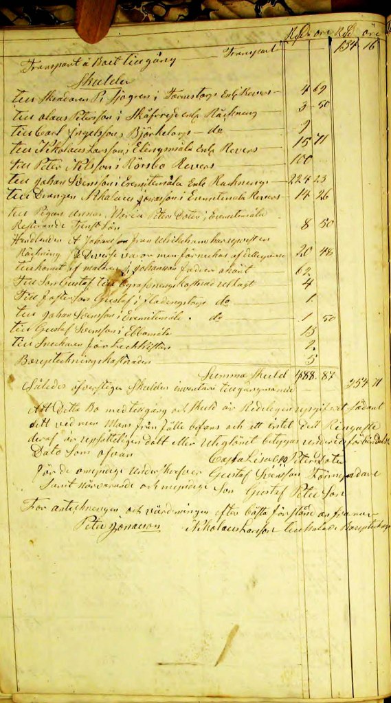till skräddaren P. Sjögren i Jornestorp enligt revers till Olaus Petersson i Skåverud enligt räkning till Carl Ingelsson i Björketorp dito till Nikolaus Larsson i Elingsmåla enligt revers till Peter Nilsson i Rörsbo revers till Johan Svensson i Eremitemåla enligt räkning till drängen Abraham Jonasson i Eremitemåla revers till pigan AnnaMaria Petersdotter i Eremitemåla – resterande tjänstelön Handlanden A Johansson från Ulricehamn har uppgett en räkning för diverse varor men förnekas av …. tillkomst av malören. A. Johansson fodren okänt till son Gustaf till begravningskostnad utlagt till fosterson.. Gustaf i Flädingstorp dito till Johan Svensson i Eremitemåla dito till Gustaf Svensson i Ebbamåla till snickaren för likkistan Bouppteckningskostnader Summa skuld 488.87
