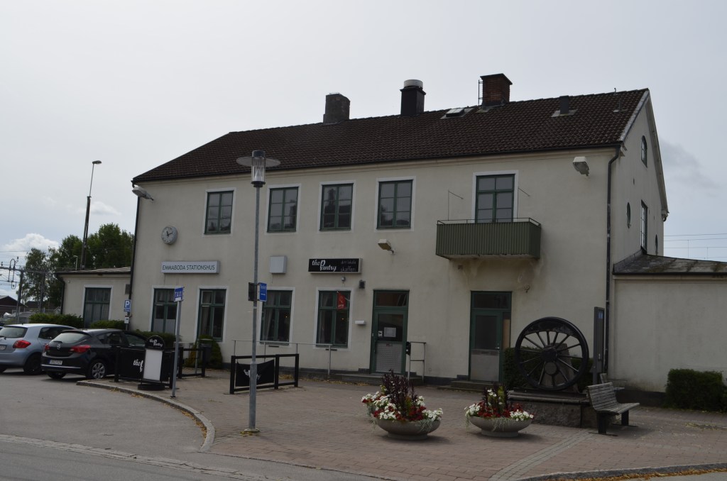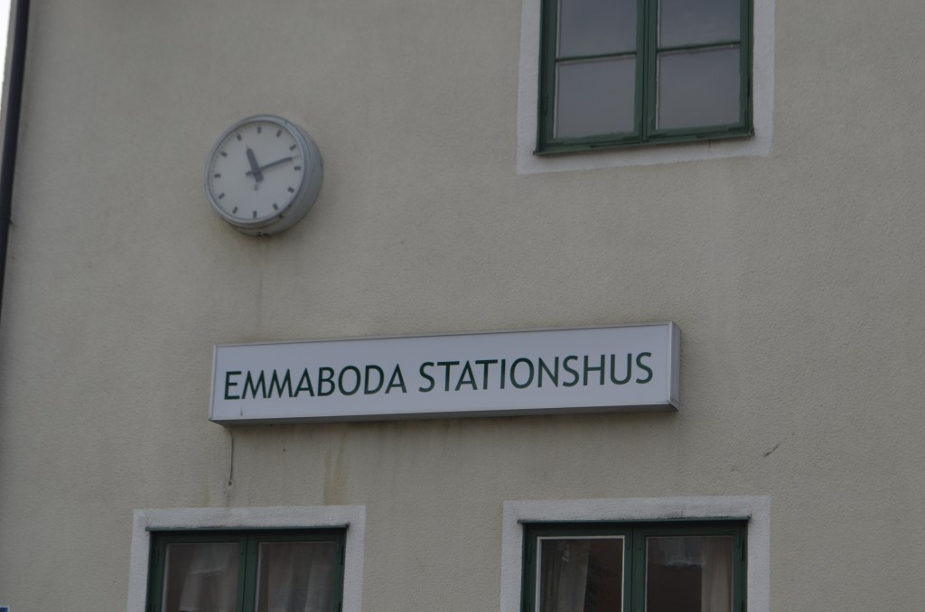 Nästa dag beger jag mig till pastorsexpeditionen i Emmaboda för att utröna om mina förmödrar alldeles säkert ligger i Långasjö. Tyvärr visar det sig att allt material sedan 10 år tillbaka finns på Landsarkivet i Vadstena och att jag får vända mig dit när jag kommer hem. Jag skulle ju ändå åka till Emmaboda och vandra runt då stan utgör en del av min mormors historia, så det gör inget. På sommaren 1914 gick hon nämligen en sykurs i stan men hade varit på Öland på en resa. Hon steg av tåget i Emmaboda. Steg av gjorde också en ung postiljon vid namn Carl Edvard Hansson som genast blev betagen av kvinnan på perrongen och följde efter henne för att se vart hon tog vägen. Ruth hade gått in i trädgården där sykursen höll till. De satt ute och sydde på eftermiddagen. Carl vågade sig in och frågade henne om hennes namn och om hon kunde tänka sig att promenera runt kvarteret. Vilket hon accepterade. För att göra en lång historia kort gifte de sig våren 1915 och flyttade till Alvesta där Carl nu hade fått fast tjänst. Jag gick upp på perrongen och tog några kort och försökte se dem framför mig och det var inte svårt.