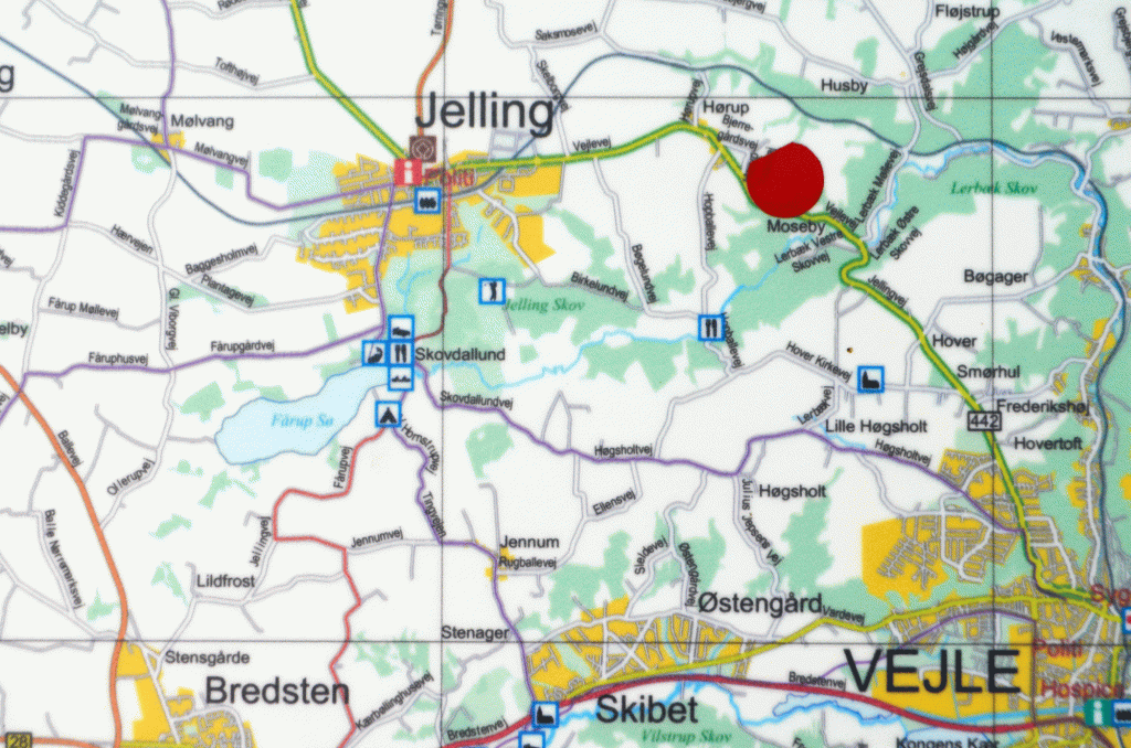 Nu beger jag mig mot Vejle för att sedan ta av mot byn Jelling. Jag är på jakt efter det moderna Danmarks födelseplats. Här ska två runstenar stå som minne för den tiden på 900-talet. Danmarks yta är som bekant ganska platt men vägen mot Jelling bjuder på svindlande kurvor ner och uppför en förkastningsspricka. Så ser jag skylten för UNESCO, jag är nära.