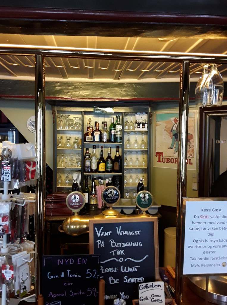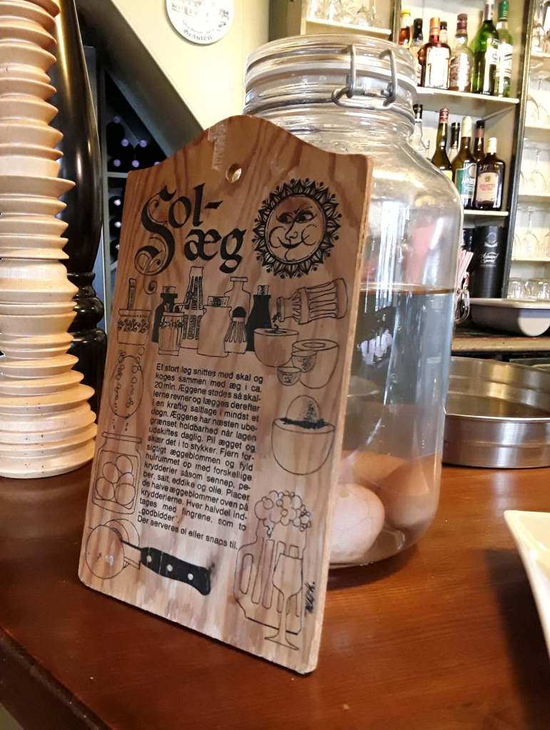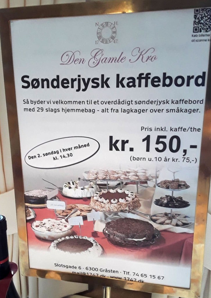 Jag går till DEN GAMLE KRO i samhället och äter dagens Stjerneskud! Där hittar jag böcker om det SÖNDERJYSKA KAFFEBORDET: en politisk handling i en tid när danskarna inte fick träffas och prata danska för tyskarna! Då skapades kaffebordet som samlingsplats och alla kvinnor kom med sin speciella kaka till bordet! Jag försökte anmäla mig till ett men det var bokat till fram i oktober! I baren kunde man köpa SOLÄGG som också är en gammal specialitet i trakterna. På väggarna hängde bilder på två drottningar.