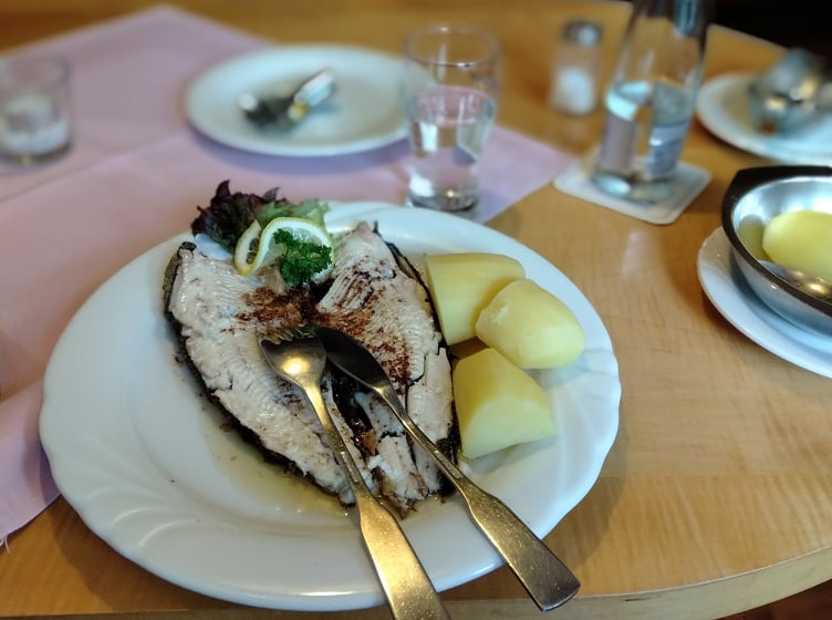 Stående inslag på menyn var forell: jag åt forell dag ut och in.. Första dagen kom den med huvud och allt; jag kunde knappt äta den utan bad den om ursäkt. Följande dagar kom den benad…