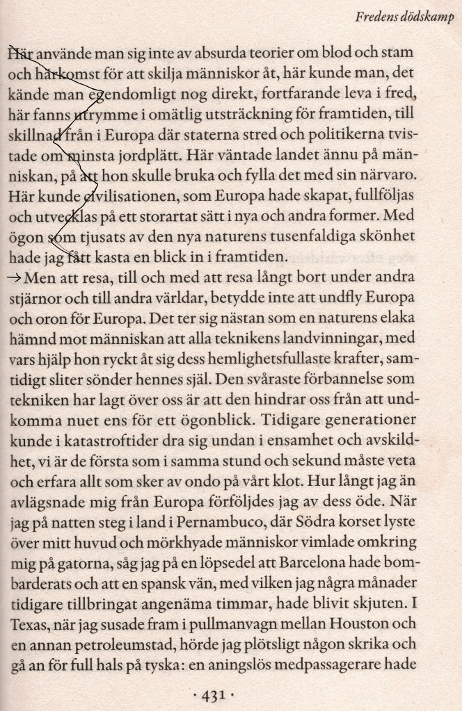 Om tiden före andra världskrigets utbrott skriver Zweig i kapitlet Fredens dödskamp s. 431-433